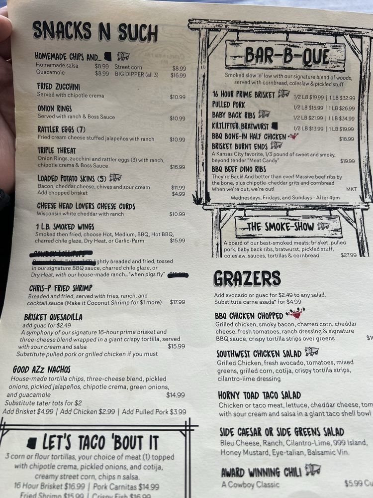 Introducing the menu at The Horny Toad in Cave Creek, AZ, is an experience that delights the senses and suits all cravings. The restaurant offers a diverse range of American fare, with highlights including their renowned fried chicken, fresh fish and chips, and a burger selection that keeps patrons returning. Many reviews praise the moist and freshly prepared dishes, complemented by homemade sides like honey butter cornbread and cheesy grits.